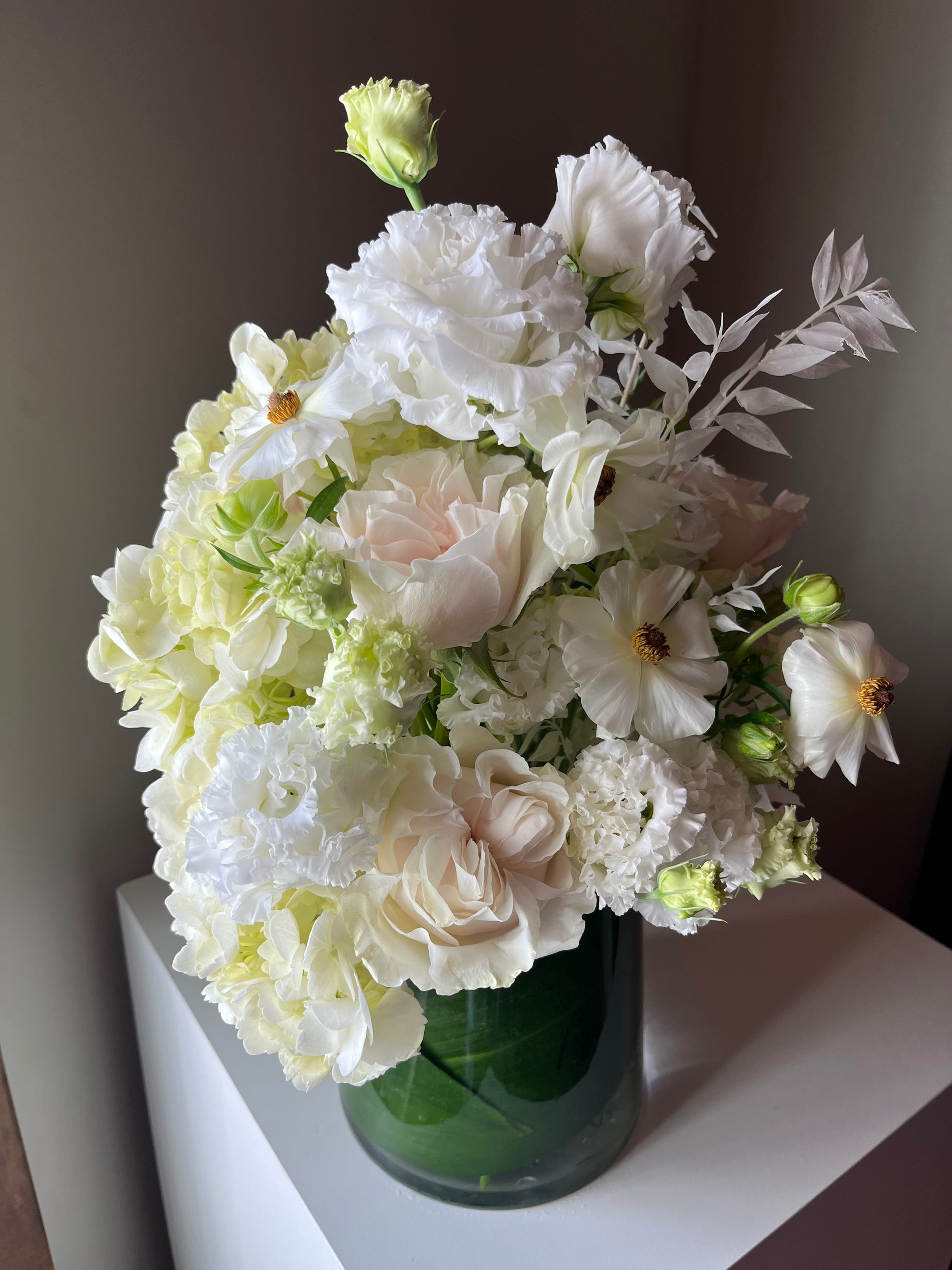 Our blanc arrangement features an assortment of beautiful white blooms and dried accents. Perfect for any occasion and bursting with fun textures, this all white arrangement is a perfect accent or finishing touch.